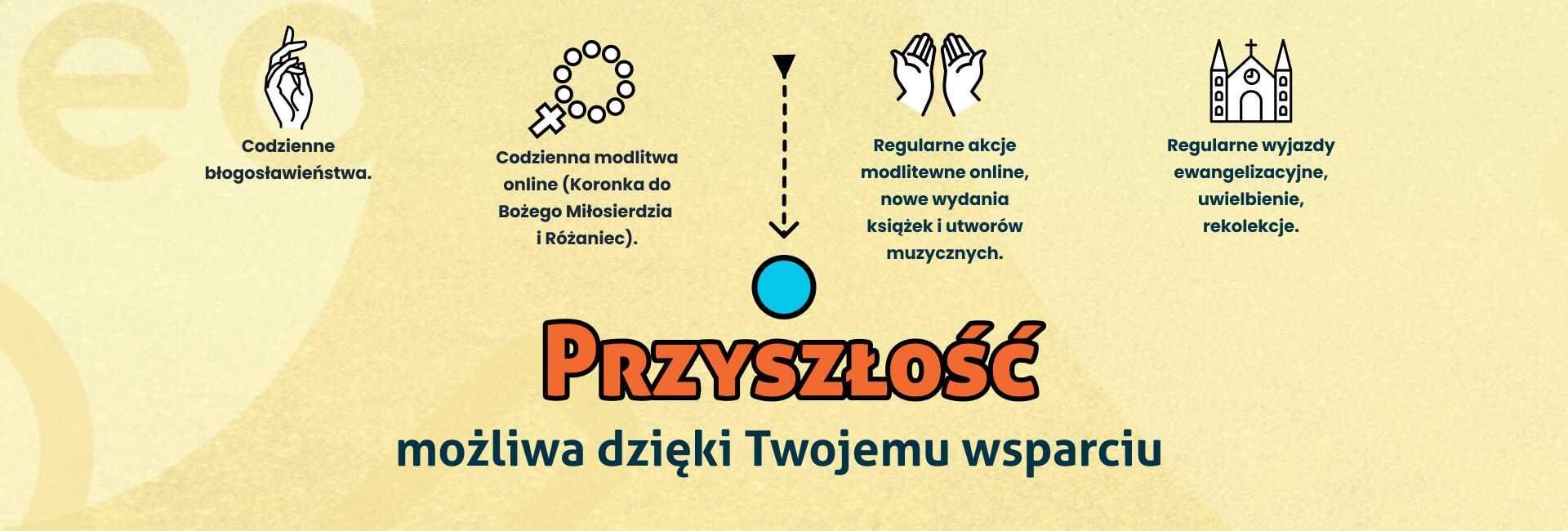 Dzięki Twojemu wsparciu możemy kontynuować naszą misję i otwierać się na nowe inicjatywy, do których zaprasza nas Duch Święty! Wszystko po to, by to nasze wspólne dzieło ewangelizacyjne mogło dalej rosnąć, rozwijać się i na długie lata pozostać źródłem nadziei, pokoju i duchowego wsparcia dla tysięcy ludzi.