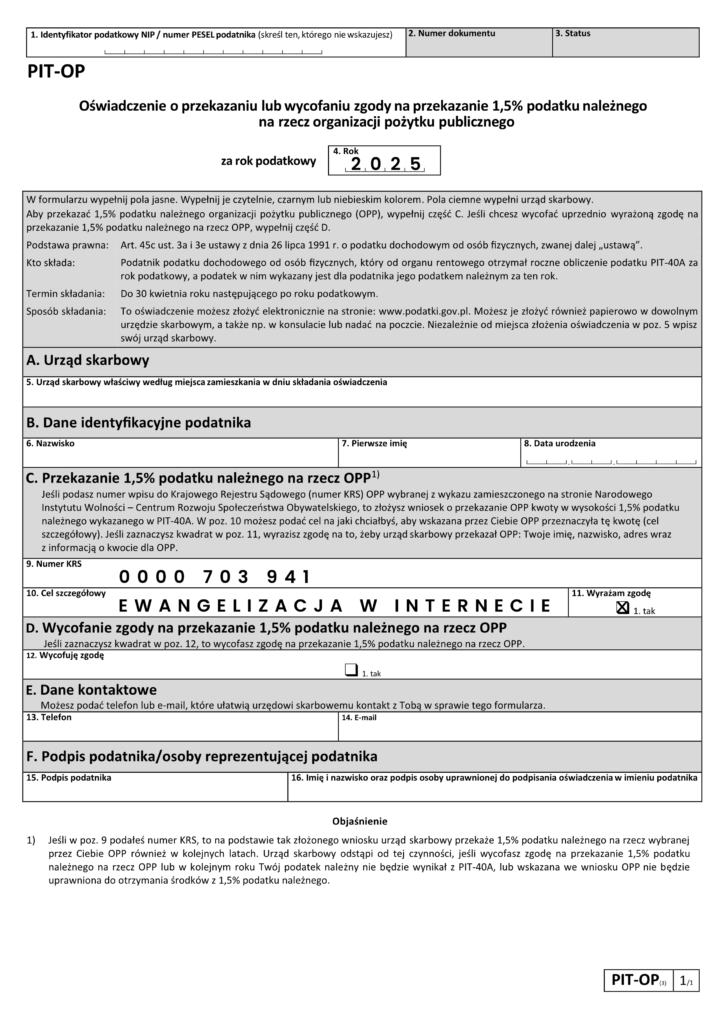 Jeśli nie uzyskałeś innych dochodów poza emeryturą i rozlicza Cię urząd skarbowy, nie musisz samodzielnie składać deklaracji PIT. Jeśli jednak chcesz przekazać 1,5% podatku na ewangelizację w internecie, należy złożyć formularz PIT-OP – w formie papierowej lub elektronicznej. Częściowo uzupełniony formularz znajdziesz poniżej. Wydrukuj go, wpisz swoje dane i przekaż do urzędu skarbowego.